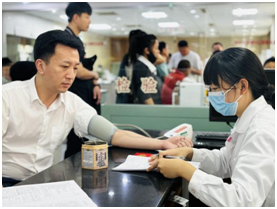 在市中心血站,志愿者們?cè)诠ぷ魅藛T的引導(dǎo)下,有序做好信息登記、健康征詢、血壓測(cè)量、初篩檢測(cè)等工作。隨后,符合獻(xiàn)血條件的8名志愿者紛紛挽起衣袖,用2600CC的熱血筑成一道延續(xù)生命的紅色城墻。